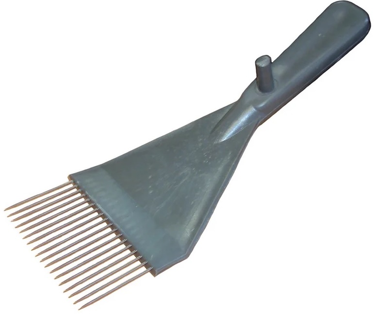 Ручка вилки изготовлена из полистирола, 18 стальных нержавеющих прямых игл, длинной 35 мм и диаметром 1мм, зафиксированых в рабочей части основы. Вилка предназначена для распечатывания медовых сотов перед откачкой меда, вскрытия кормовых сот в весенний период и удаления крышечек трутневых ячеек. При распечатывании медовых сотов иголки вилки вводятся под забрус, начиная с нижнего бруска рамки по направлению к верхнему. Распечатывание сотов указанным способом более быстрое и легкое. Некоторые пчеловоды вилку дополнительно разогревают в горячей воде. Размеры (мм): 190×70×30