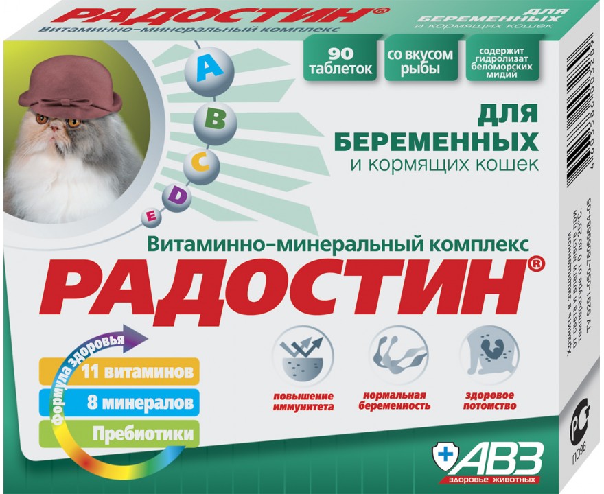 Витаминно-минеральный комплекс РАДОСТИН для беременных и кормящих кошек. Это комбинированная добавка, в которой витамины, макро- и микроэлементы находятся в сбалансированном, физиологически обоснованном соотношении, обеспечивая таким образом его максимальную эффективность. РАДОСТИН оказывает благоприятное воздействие на организм беременных и кормящих кошек, активизирует обмен веществ, укрепляет иммунитет, способствует нормальному протеканию беременности, профилактирует послеродовые осложнения и повышает биологическую ценность молока. РАДОСТИН – торговая марка российской компании «Агроветзащита», которая с 1993 г. занимается разработкой и производством лекарственных средств для животных. Содержащийся в составе комплекса РАДОСТИН таурин, составляющий 50 % всех свободных аминокислот сердца, поддерживает целостность сетчатки глаза, что предотвращает развитие слепоты, повышает плодовитость животных, устраняет риск выкидышей, способствует росту котят. Таурин участвует в механизмах свертывания крови, иммунных процессах, регулирует функционирование нервной системы. Входящий в состав комплекса селен необходим для нормального протекания беременности и роста как плодов, так и котят-сосунов. Пребиотики совместно с гидролизатом беломорских мидий и хитозаном предупреждают возникновение расстройств кишечника, значительно повышают устойчивость организма к вредным воздействиям окружающей среды. Ключевые особенности: • Формула здоровья для Вашей кошки: 11 витаминов, 8 минералов и пребиотики. • Повышает иммунитет кошки. • Аппетитные витамины со вкусом рыбы содержат гидролизат беломорских мидий, который гарантирует здоровые пищеварение Вашего питомца, а также нормальное протекание беременности и здоровое потомство. ПОКАЗАНИЯ К ПРИМЕНЕНИЮ: Для профилактики и лечения нарушений обмена веществ у кошек, витаминной и минеральной недостаточности, развивающихся на их фоне патологий беременности, родов, послеродового периода и периода лактации, а также для снижения эмбриональной смертности, повышения жизнеспособности новорожденных котят. ДОЗЫ И СПОСОБ ПРИМЕНЕНИЯ: Витаминно-минеральный комплекс «Радостин» дают беременным и кормящим кошкам ежедневно, в течение 14–30 дней, с небольшим количеством корма, в дозе: Вес кошки до 5 кг – 1 таблетка на 1 кг массы тела. Вес кошки более 5 кг – 6 таблеток на животное. ПРОТИВОПОКАЗАНИЯ И ПОБОЧНЫЕ ЯВЛЕНИЯ: Не имеет. Добавка совместима с лекарственными средствами и другими кормовыми добавками. СОСТАВ (в 1 таблетке комплекса, не менее): Витамин А – 200,0 МЕ Витамин В1 – 0,72 мг Витамин В2 – 0,72 мг Витамин В3 – 0,45 мг Витамин В5 – 1,35 мг Витамин В6 – 1,35 мг Витамин В12 – 2,7 мкг Витамин С – 18 мг Витамин D3 – 8 МЕ Витамин Е –9,6 мг Биотин – 3,15 мкг Железо – 1,0 мг Йод – 0,03 мг Кальций – 21,25 мг Медь – 0,1 мг Селен – 10,0 мкг Фосфор - 11,25 мг Цинк – 0,55 мг Лактулоза – 63,0 мг Гидролизат беломорских мидий – 0,1 гр Хитозан – 10,0 мг Таурин – 4,5 мг Крахмал – 0,025 гр Лактоза – 0,232 гр. ХРАНЕНИЕ: Хранить в защищенном от света и влаги месте, при температуре от 0 до 25°С. Информация о составе и ингредиентах, цветовом решении, технических и иных характеристиках, стране-изготовителе, внешнем виде и комплекте поставки товара носит справочный характер и основана на последних доступных к моменту публикации сведениях. Доставка данного товара осуществ